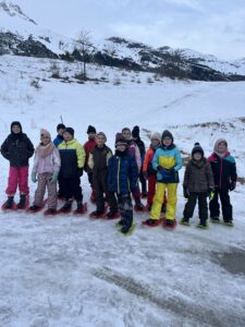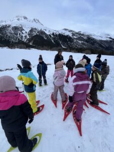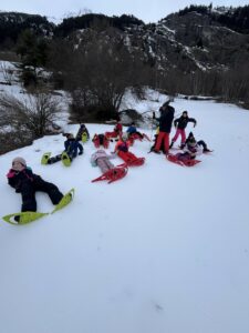 En effet, ce matin, randonnée en raquettes. Nous avons pu apercevoir des chamois et bouquetins avec la longue vue de notre guide. Nous avons marché 2 heures et beaucoup glissé sur des toboggans naturels.